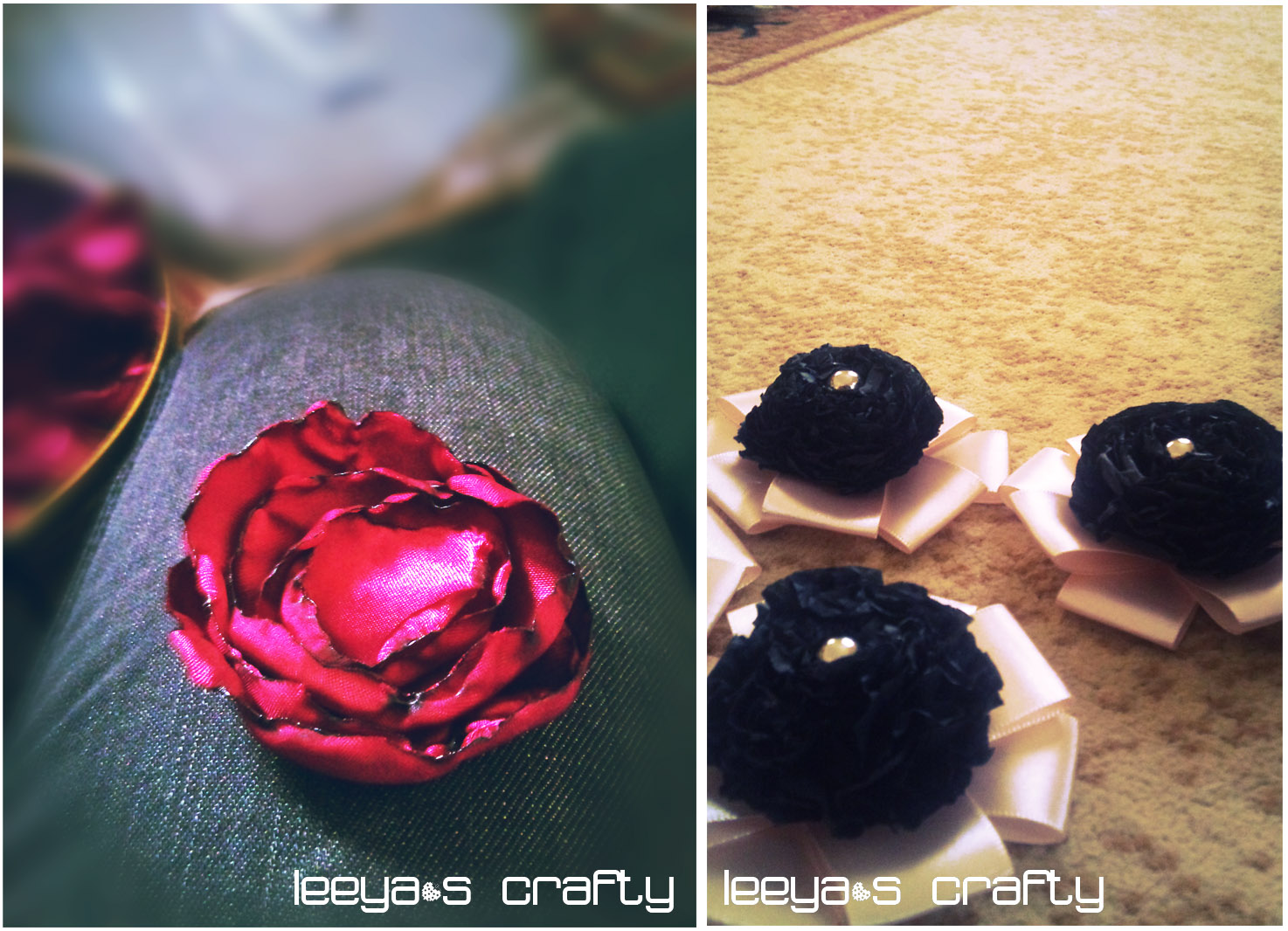hurm.Bunga tangan..tengah fikir nak buat modern style.maybe button hand bouquet or felt or see howla.here some of the work i did for my wedd soon,my family boutonniere ,i made from tissue paper and ribbon.The other one for my panel,i use silk fabric to make a blossom flower.Look alike jela.Belum letak button / beads kat tgh lagik..so look plain.